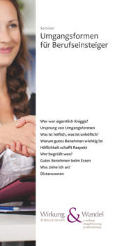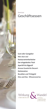 _____________________________________________ Ort: bei Ihnen, bei uns oder am Seminarort Ihrer Wahl Umfang: mindestens 2 Stunden Teilnehmerzahl: maximal 10 Personen (andere Gruppengrößen in Absprache) Neugierig wie gut gute Umgangsformen ankommen? |